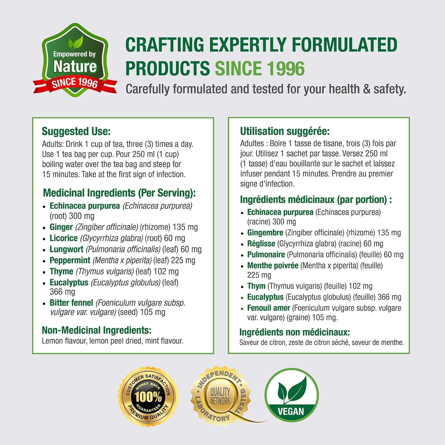 Adults: Drink 1 cup of tea, three (3) times a day. Use 1 tea bag per cup. Pour 250 ml (1 cup) boiling water over the tea bag and steep for 15 minutes. Take at the first sign of infection.