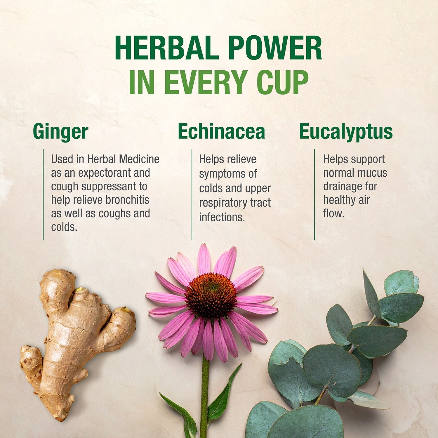 - Ginger traditionally used in Herbal Medicine as an expectorant and cough suppressant (antitussive) to help relieve bronchitis as well as coughs and colds.